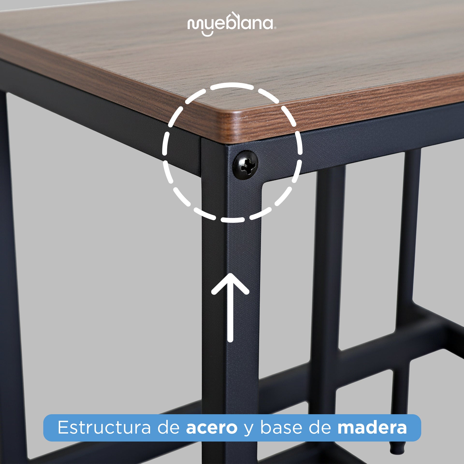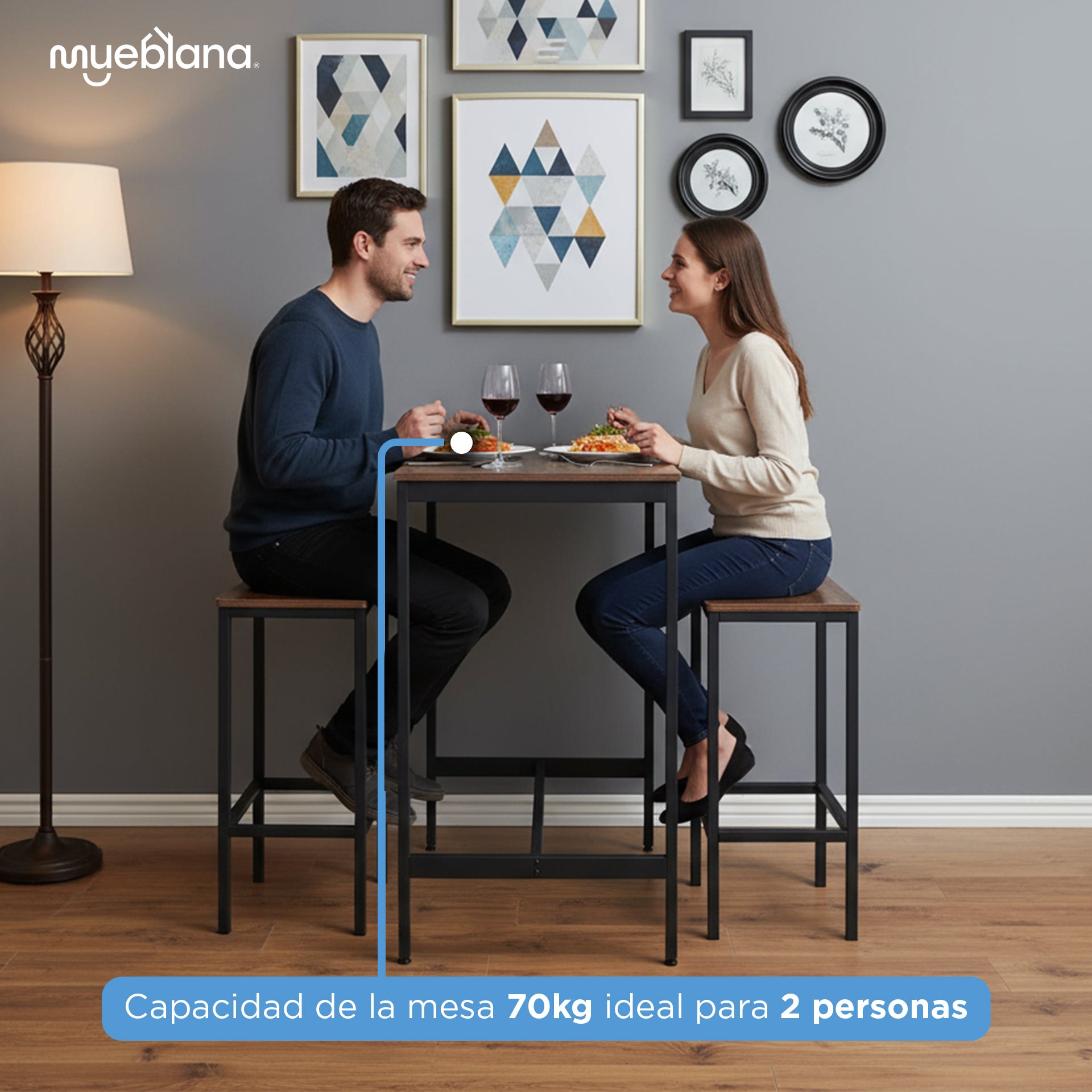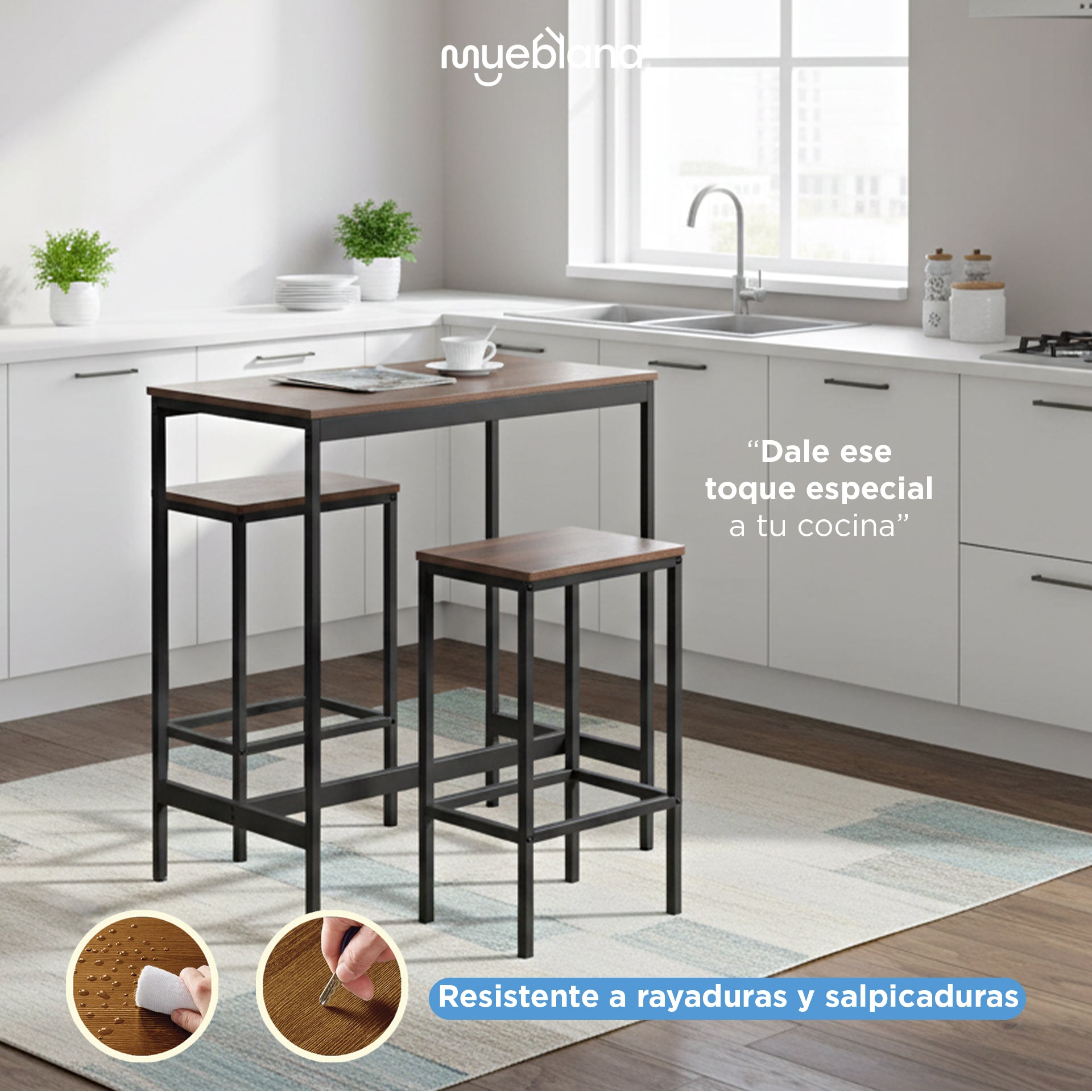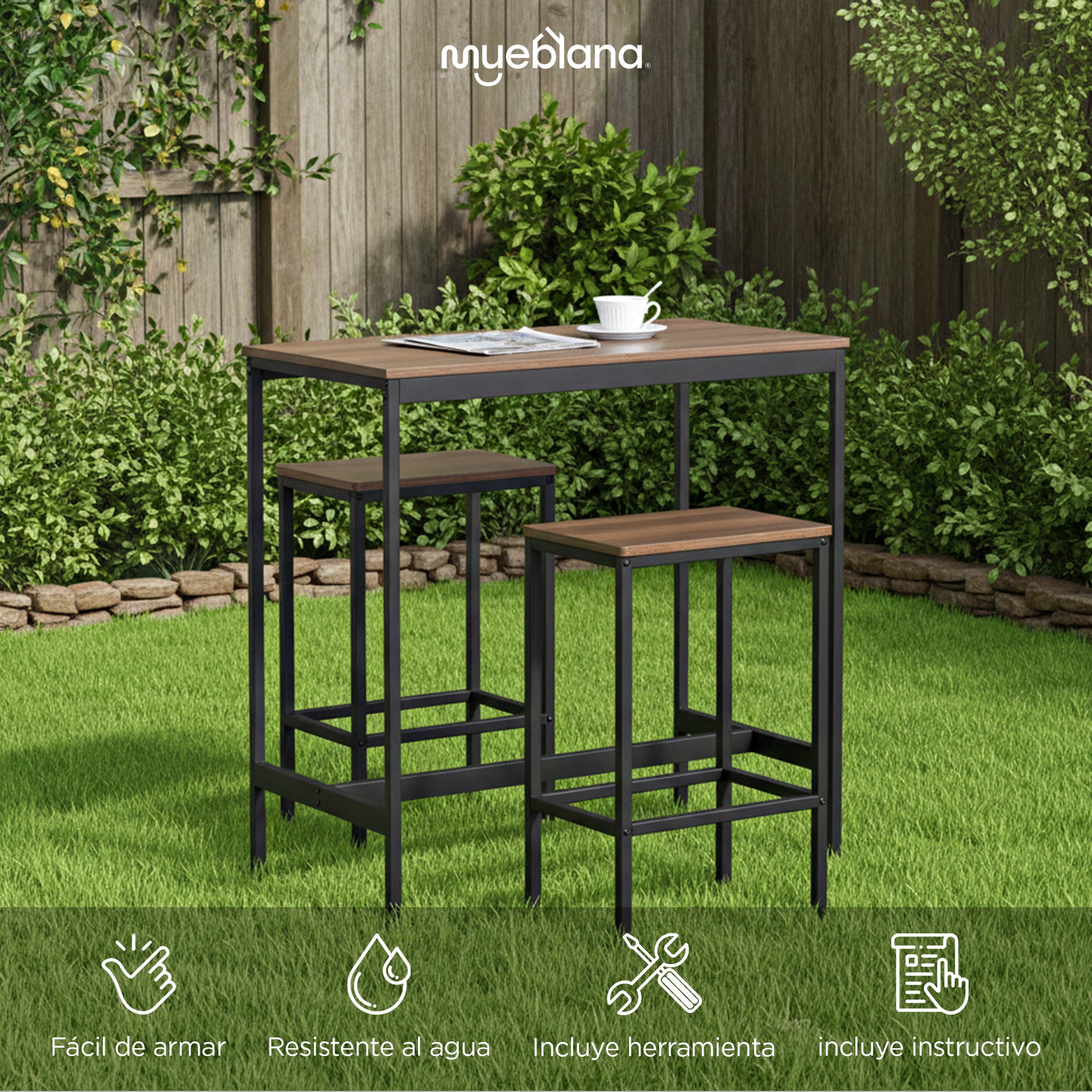 Aporta funcionalidad y estilo a tu hogar con esta mesa alta con dos bancos Mueblana. Su diseño compacto y elegante es perfecto para espacios pequeños como cocinas, terrazas o balcones. Fabricada con estructura de acero y superficie de madera, es resistente al agua y al uso diario. Soporta hasta 30 kg en la mesa y 80 kg en cada banco. Además, es muy fácil de armar gracias a su instructivo y herramientas incluidas. Ideal para quienes buscan una solución práctica sin sacrificar el estilo.