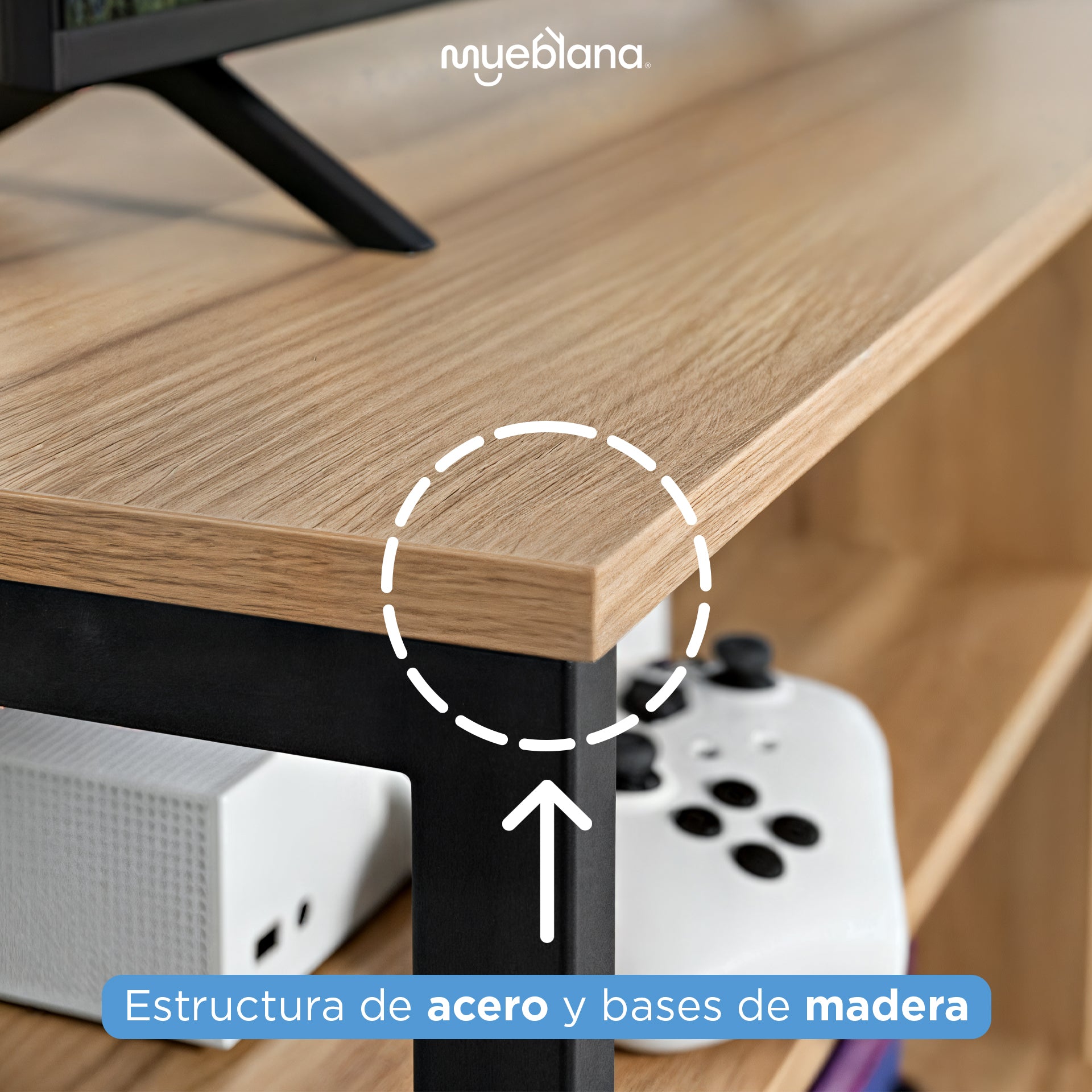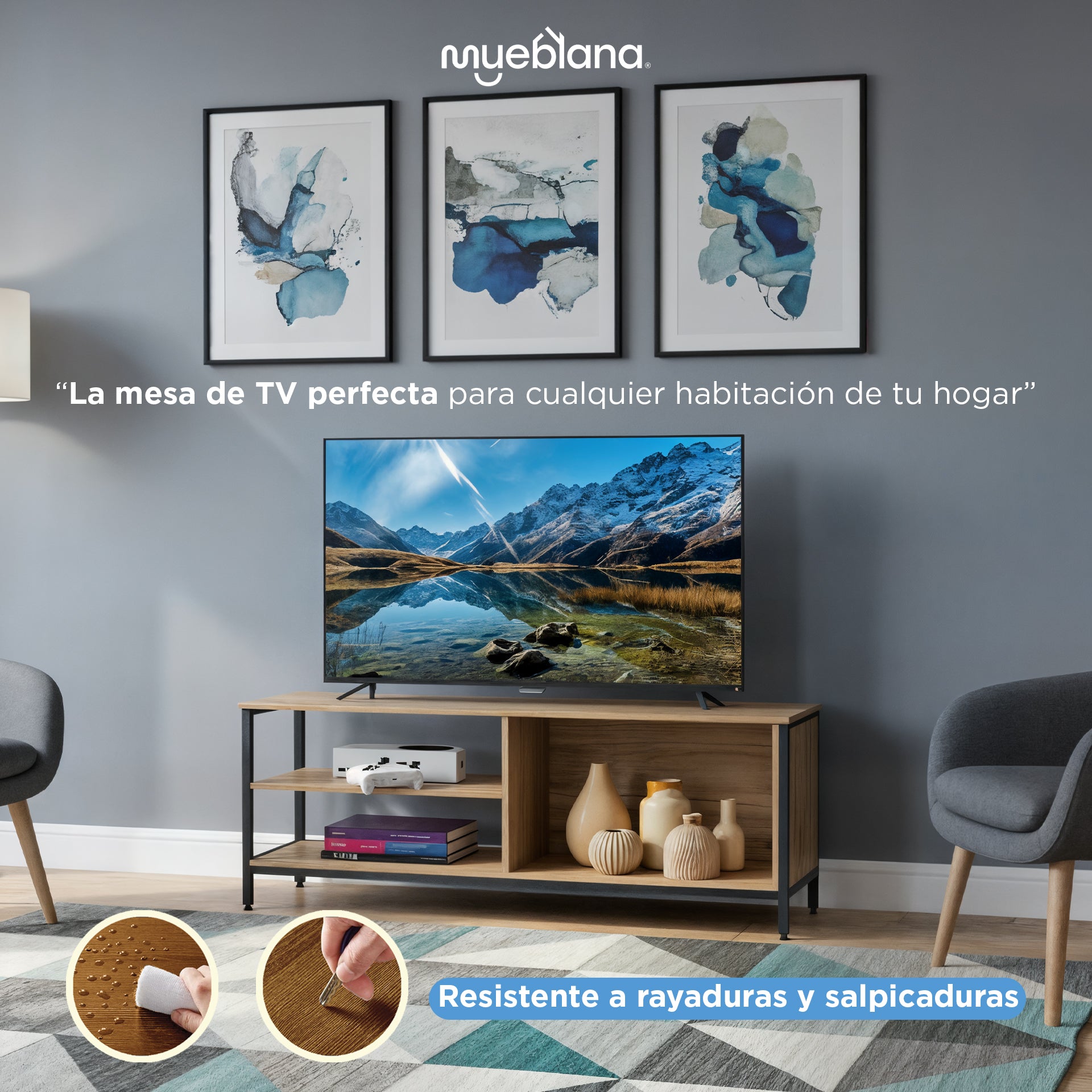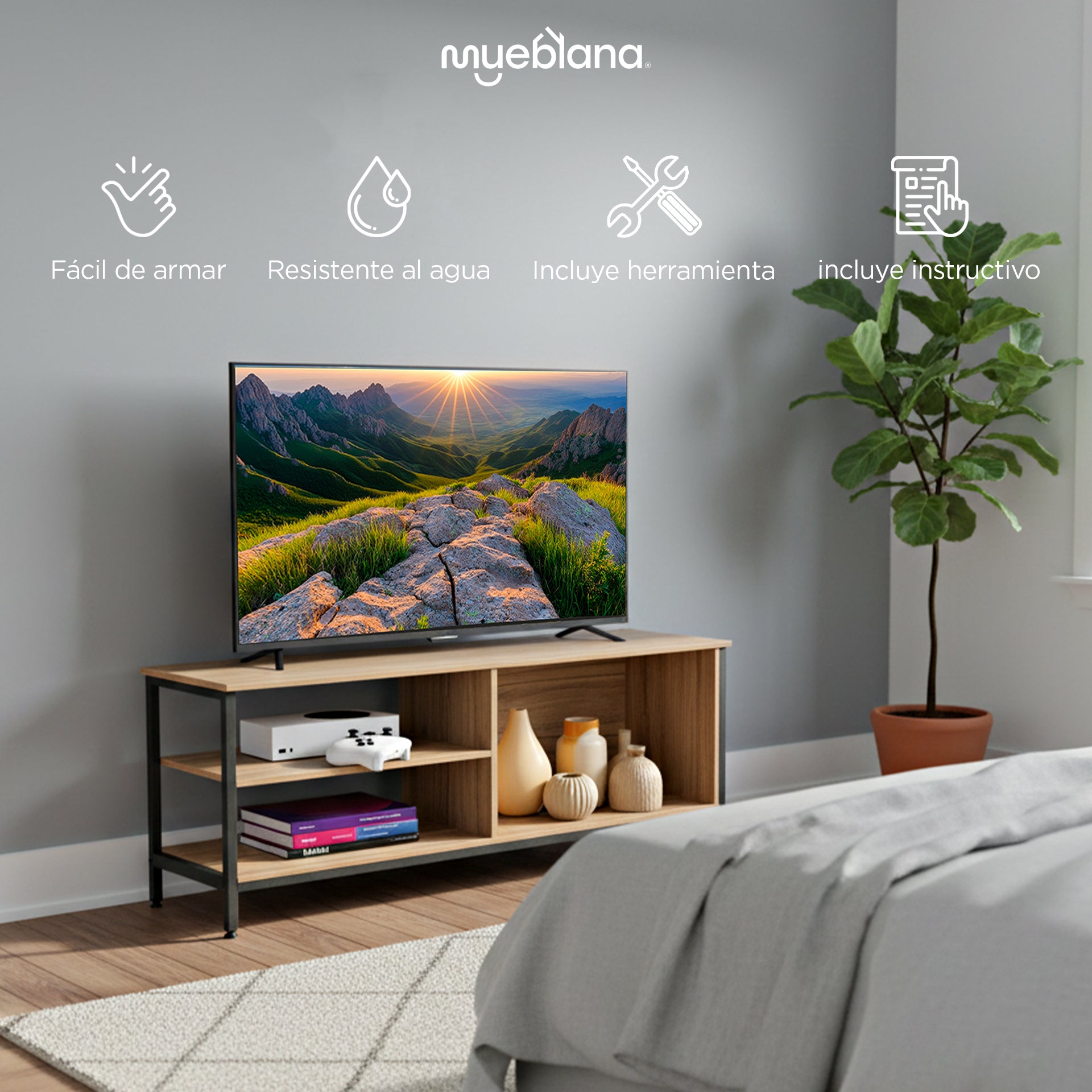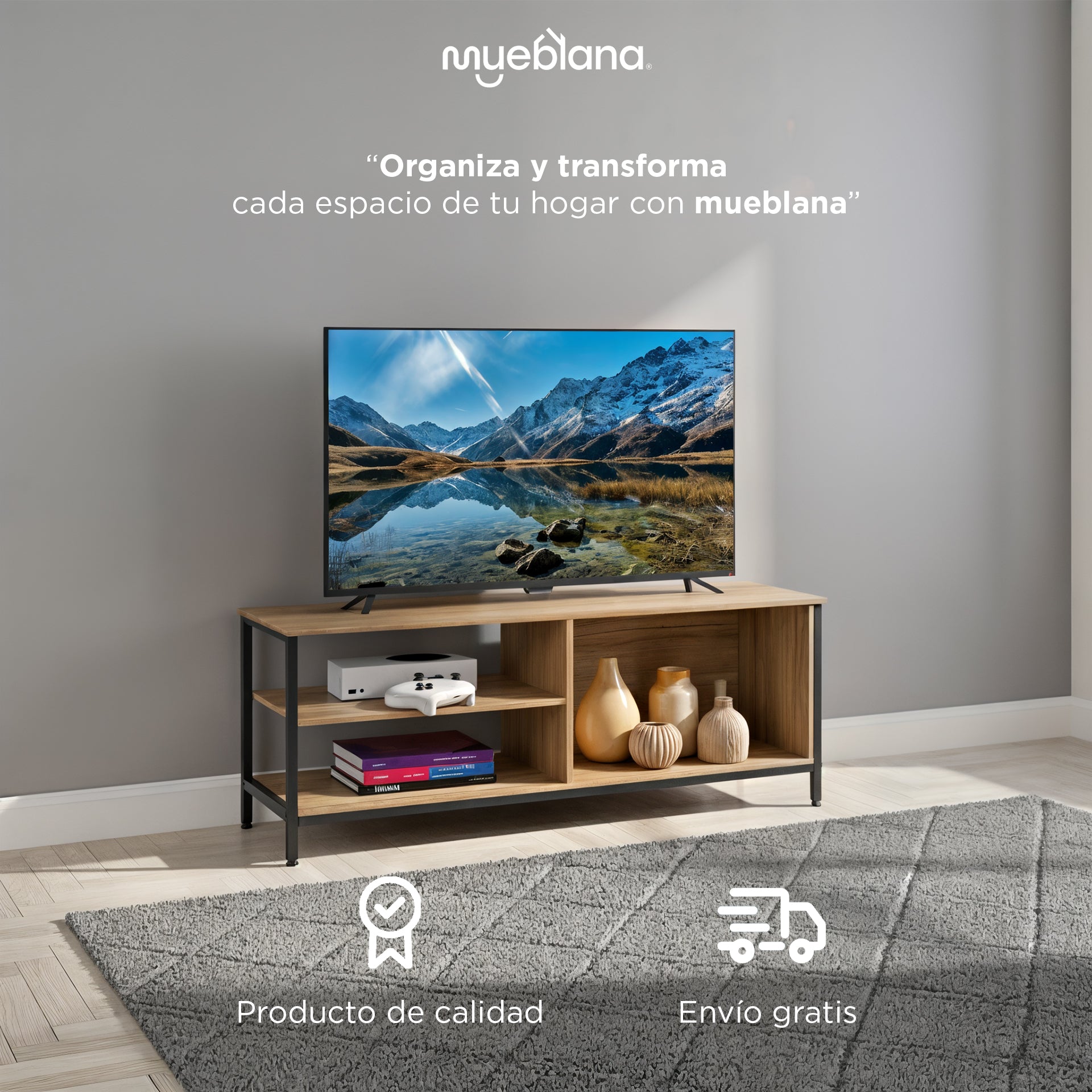 con la Mesa para TV "Austin" de Mueblana. La mesa “Austin” redefine el espacio de entretenimiento, ofreciendo un diseño contemporáneo y características innovadoras.