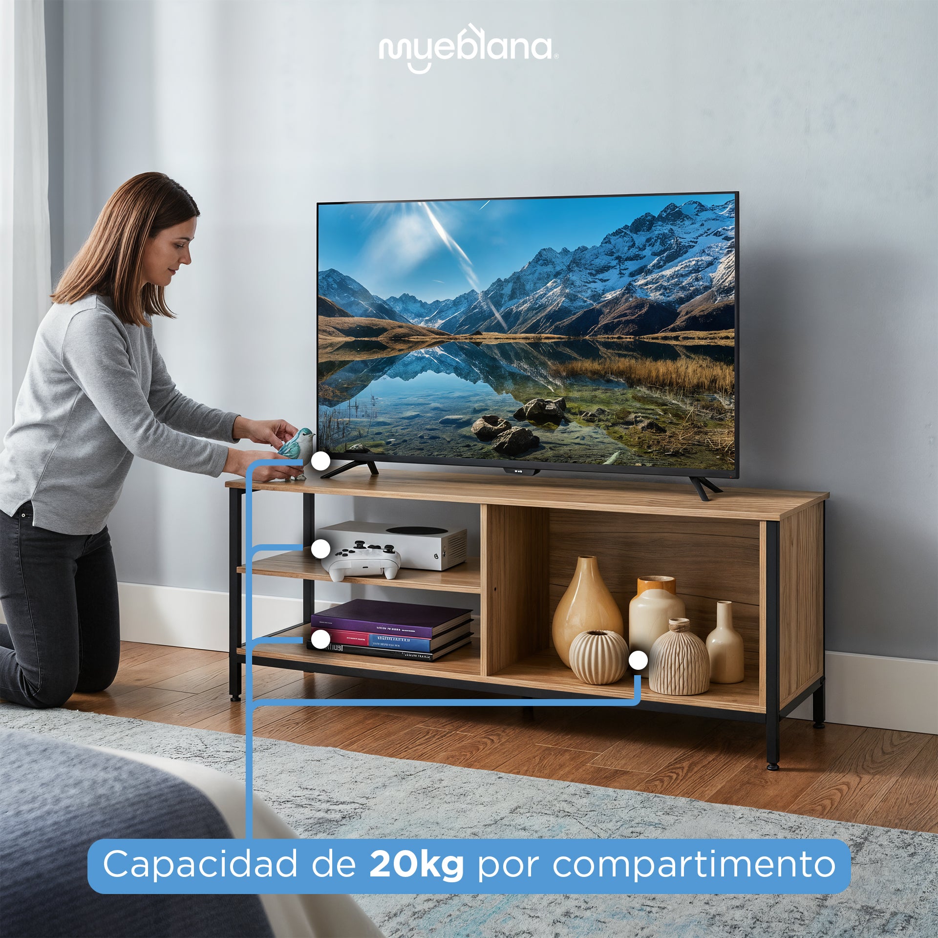 • Diseño en Rack: El formato en rack añade un toque contemporáneo al espacio, ofreciendo un lugar elegante y funcional para tu televisor y equipos multimedia.