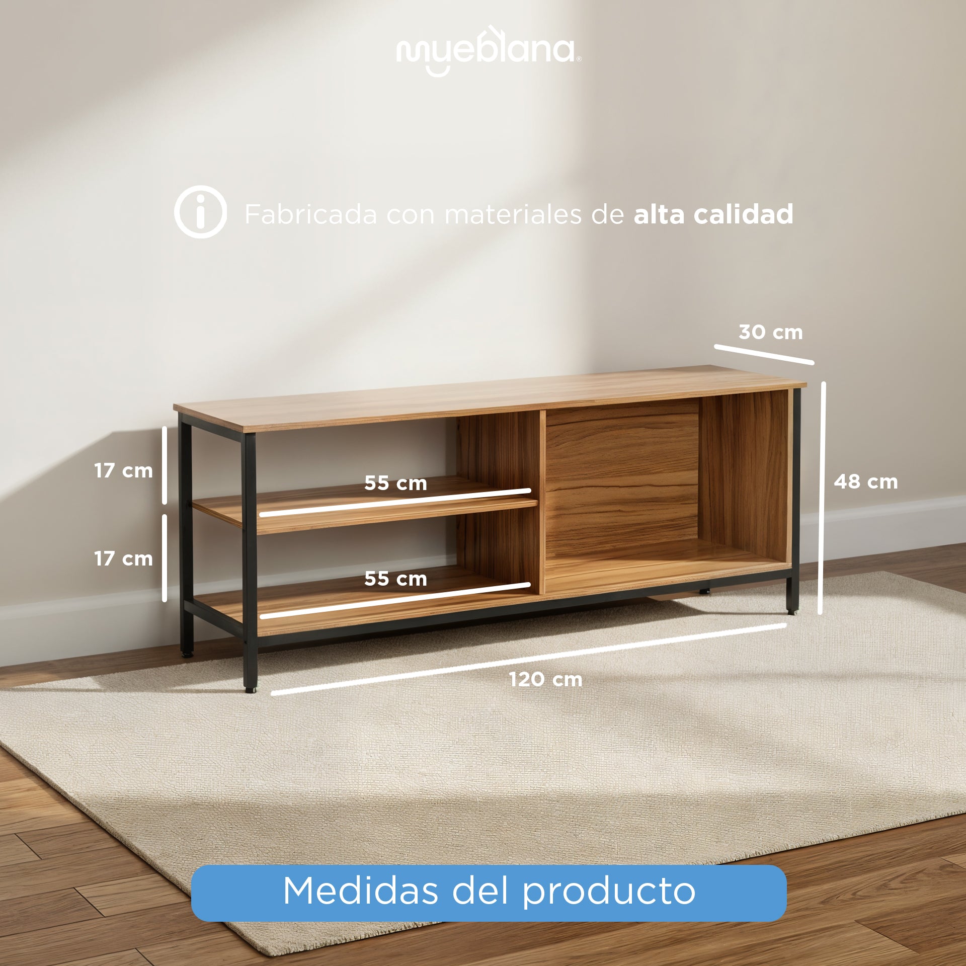 • Dimensiones Perfectas: Con dimensiones de 120 cm de ancho, 30 cm de profundidad y 48 cm de altura, la Mesa para TV "Austin" se adapta a espacios de diferentes tamaños, optimizando tu área de entretenimiento.
