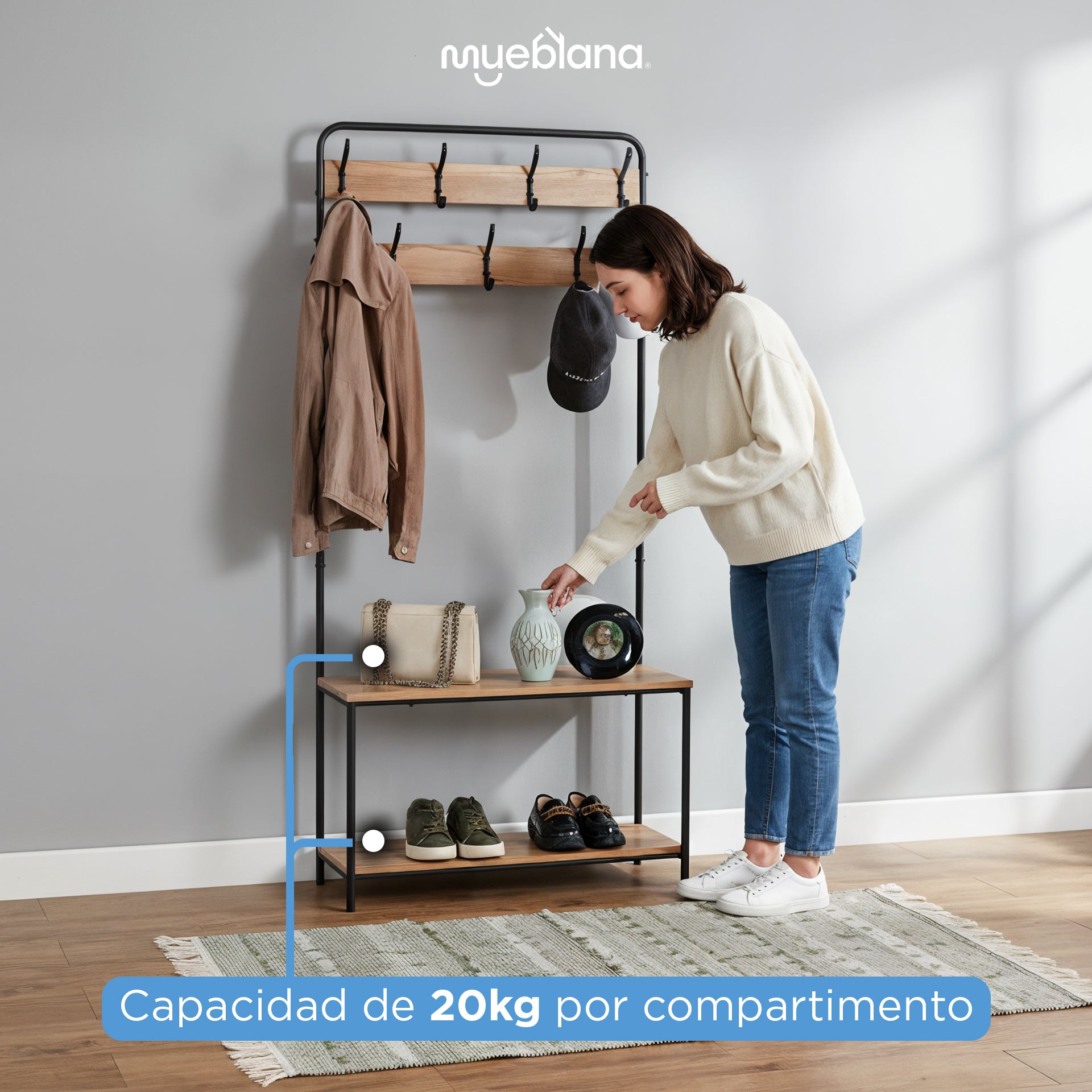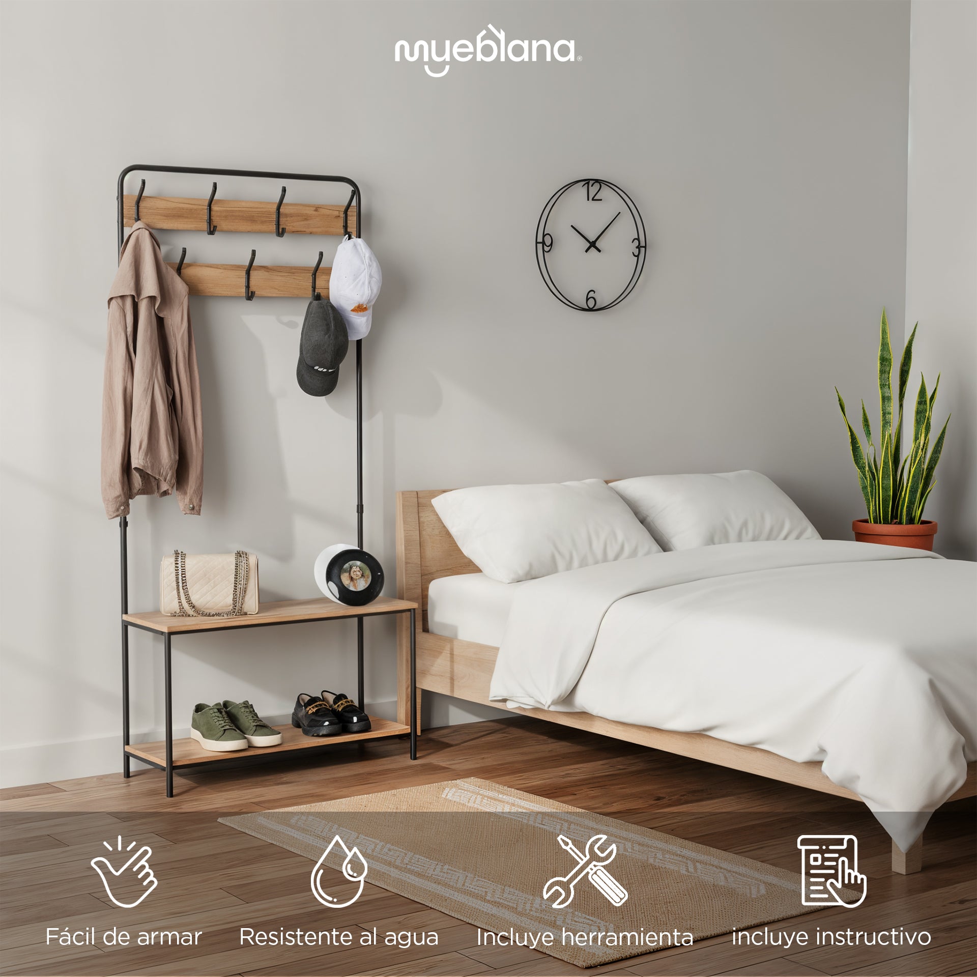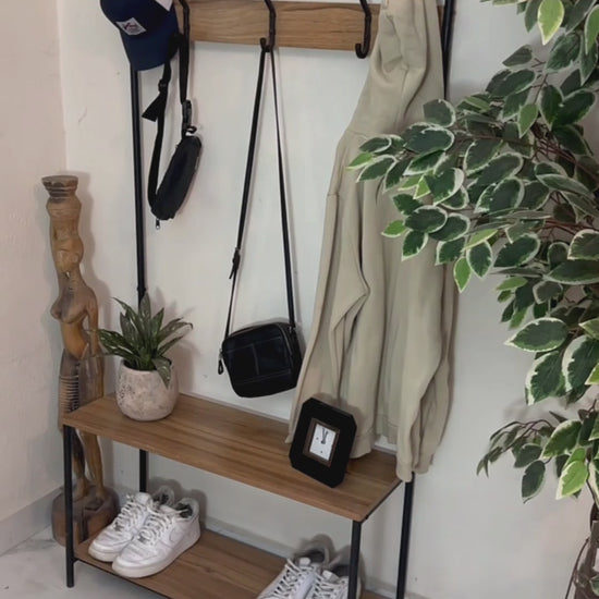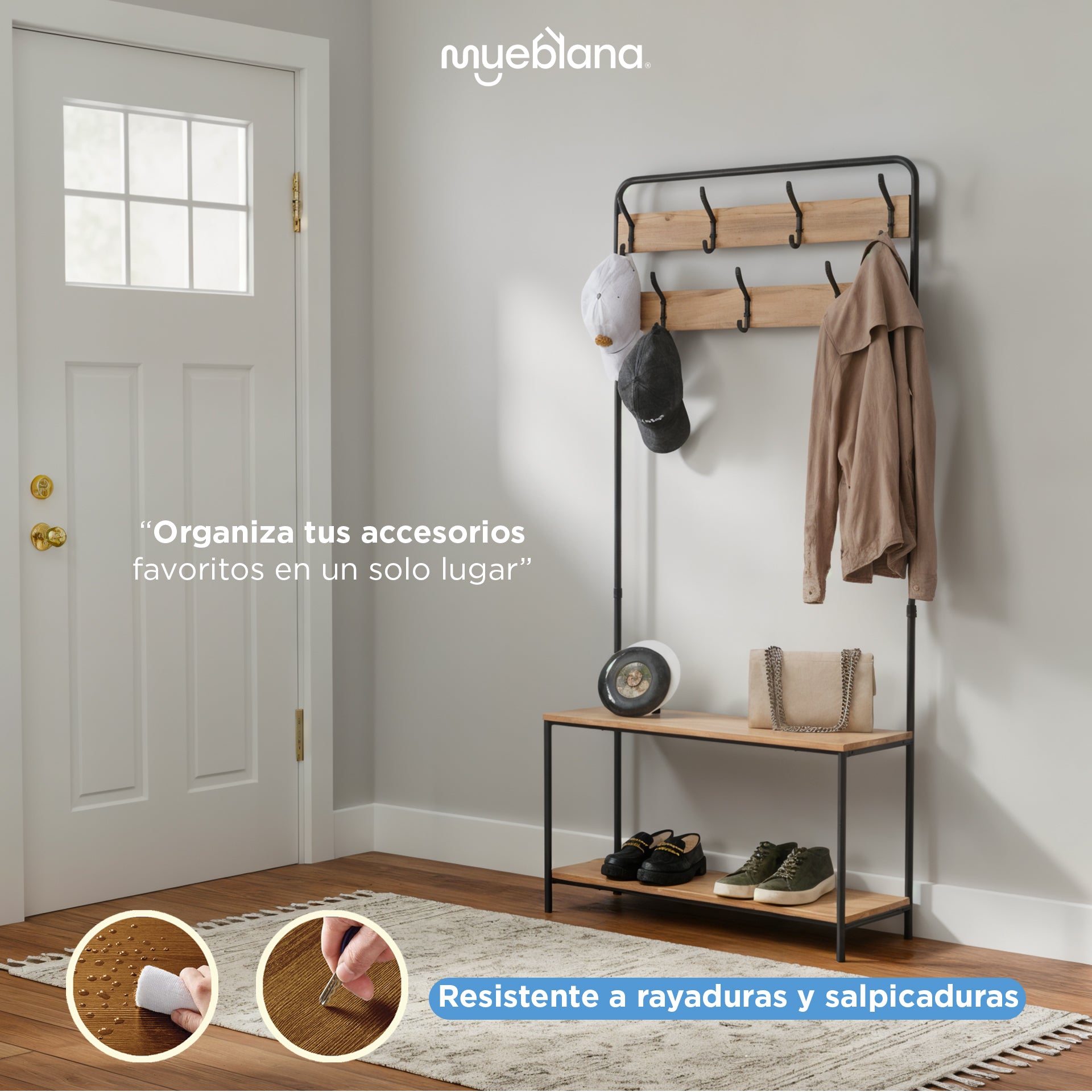 El Perchero Armenia es perfecto para ubicar en cualquier espacio de tu hogar. Funciona como zapatero, perchero, recibidor o librero y lo puedes instalar en tu sala, oficina, cocina, terraza o baño. Es un mueble con estructura de acero y melamina.